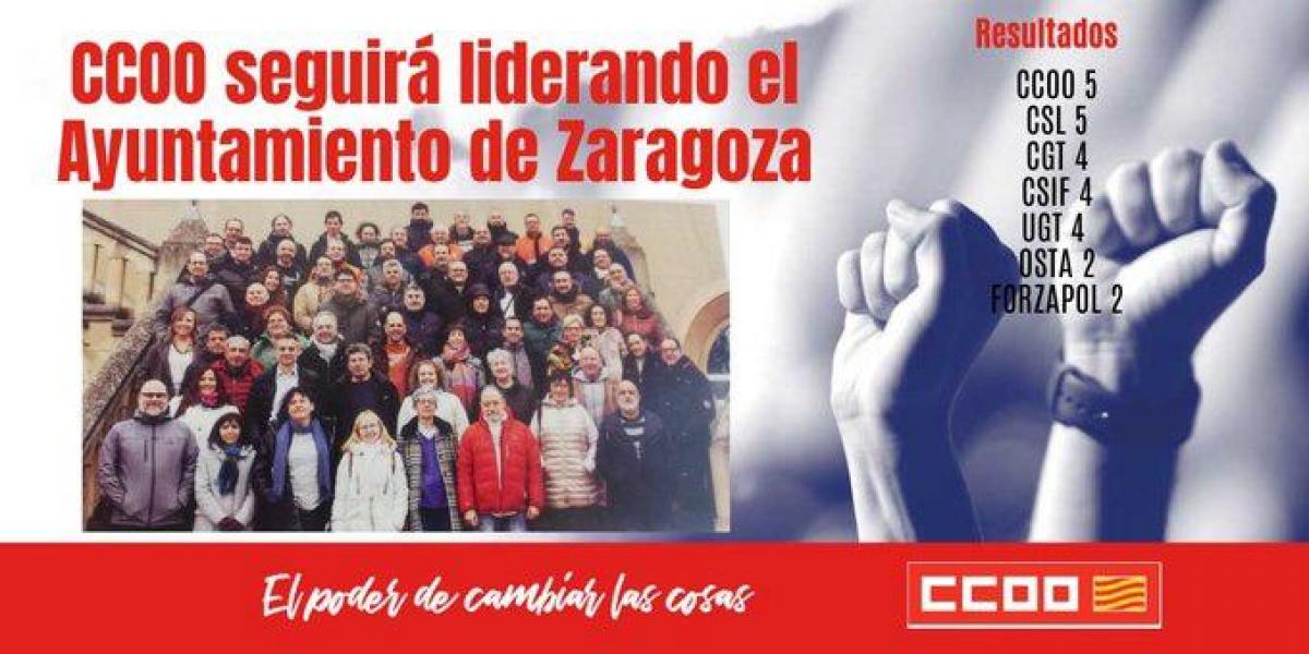• CCOO seguir谩 liderando, junto a CSL con el mismo n煤mero de delegados/as, la representaci贸n sindical en el Ayuntamiento de Zaragoza